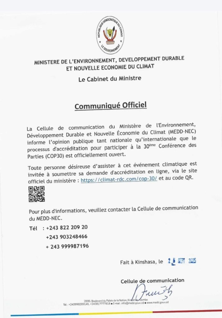 À travers un communiqué signé ce jeudi 24 septembre 2025 par sa cellule de communication, le Ministère de l’Environnement, Développement Durable et Nouvelle Économie du Climat ( MEDD-NEC), lance officiellement le processus d’accréditation des journalistes.