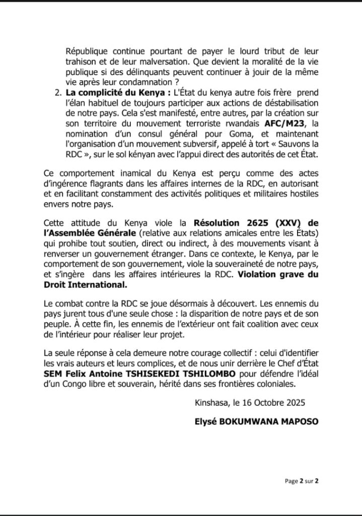 《Cela s’est manifesté, entre autres, par la création sur son territoire du mouvement terroristes rwandais AFC M23, la nomination d’un consul général pour Goma et maintenant l’organisation d’un mouvement subversif appelé à tord Sauvons la RDC 》peut-on lire dans ce communiqué.