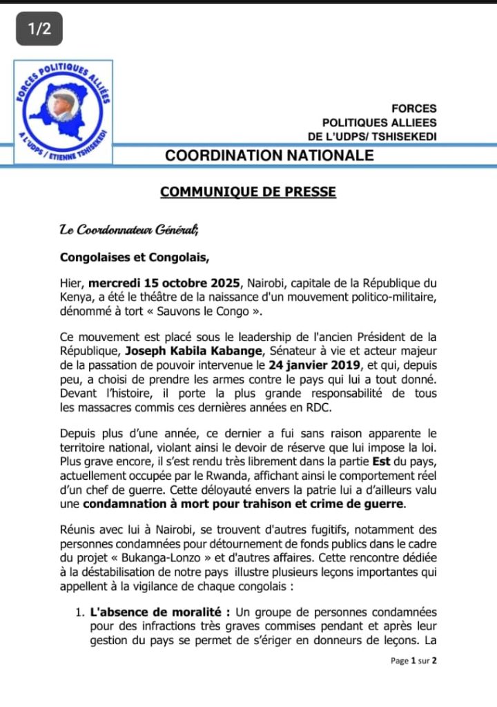 Les Forces Politiques Alliés de l’UDPS/Tshisekedi, qualifie de Théâtre, la naissance à Nairobi du mouvement selon elles, politico-militaires Sauvons la RDC.