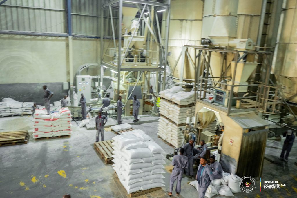 Visitant les usines du Grand Moulin de Kinshasa-GMK, le Ministre du Commerce Extérieur a été émerveillé par la capacité de production de cette société qui est de 9.000 tonnes de farine de maïs par mois, alors que la demande locale est de 7.500 tonnes et 30.000 tonnes pour la farine de froment pour une demande de 20.000 tonnes mensuellement.