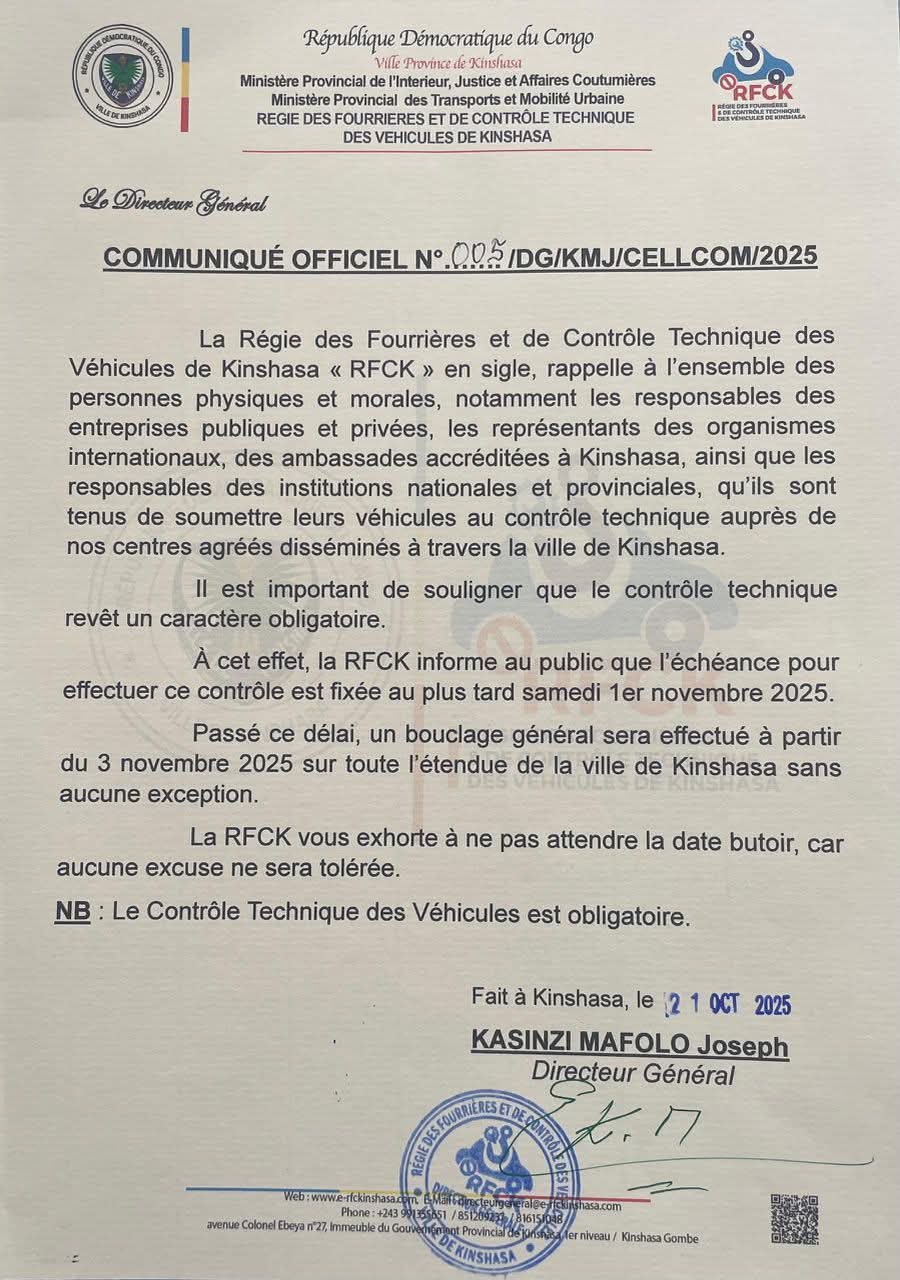 Dans un communiqué officiel rendu public ce mardi 21 Octobre 2025, dont une copie est parvenue à la rédaction de Totaleinfo.cd, la Régie des Fourrières et de Contrôle Technique des Véhicules de Kinshasa (RFCK) informe que l’opération de bouclage general des véhicules débute le 3 novembre prochain sur toute l’étendue de la ville de Kinshasa sans aucune exception.