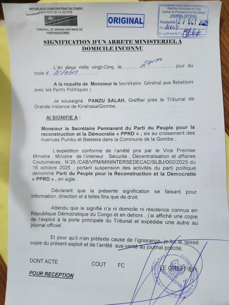 Ce parti politique de l’ancien Président Joseph Kabila a été signifié de cette decision de la justice congolaise ce lundi 27 octobre au secrétaire permanent, l’arrêté du Ministre de l’Intérieur du 18 octobre 2025, portant suspension des activités du PPRD